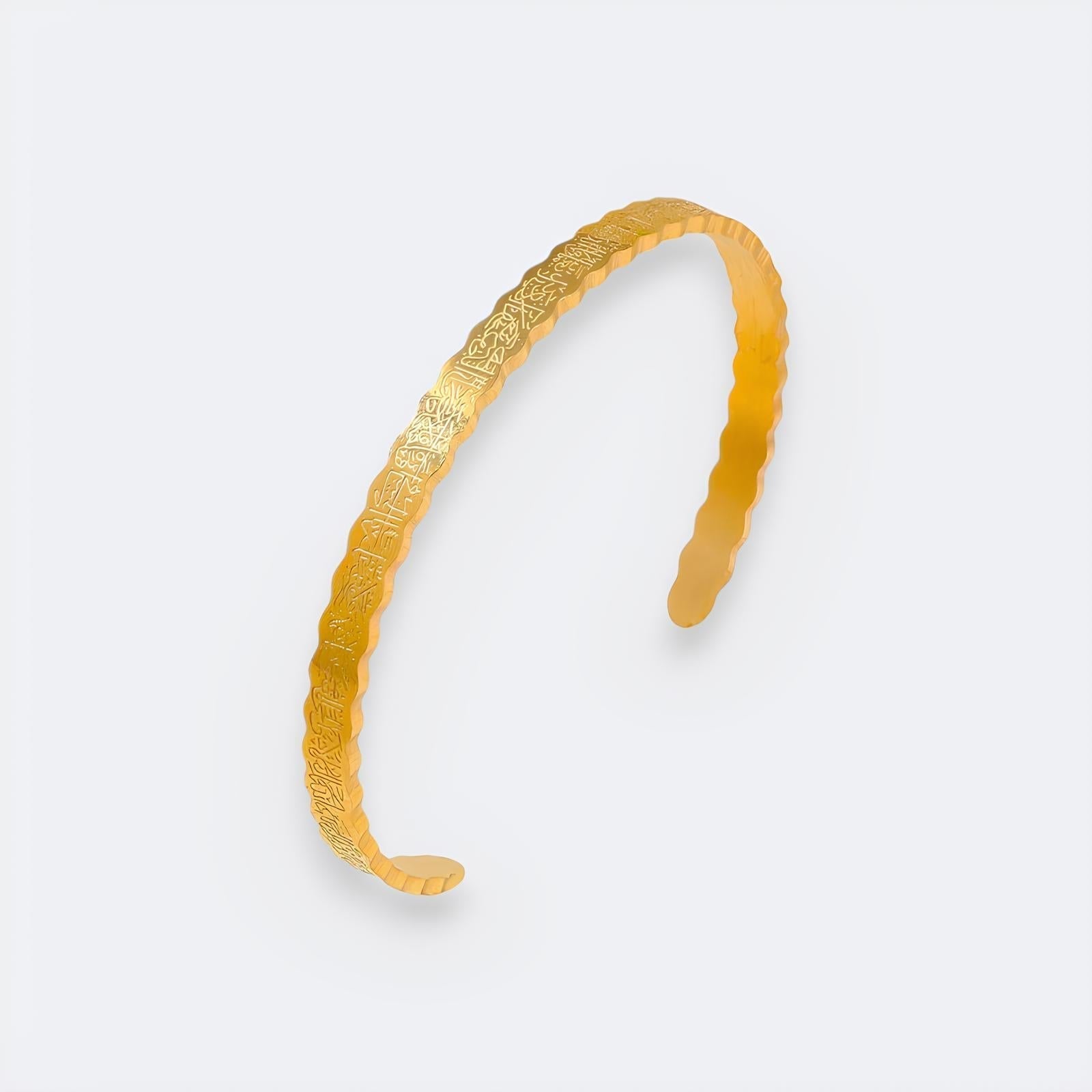 Embrace the divine with the Ayatul Kursi Rippled Cuff, featuring the powerful verse from the Quran, Ayatul Kursi. This elegant cuff, adorned with a distinctive rippled edge, is crafted from high-quality stainless steel and coated in real 18K gold plating.